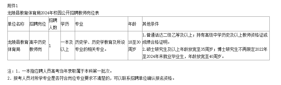 龍陵縣教育體育局計劃校園公開招聘教師1人。詳見《龍陵縣教育體育局2024年校園公開招聘教師崗位表》(見附件1)。