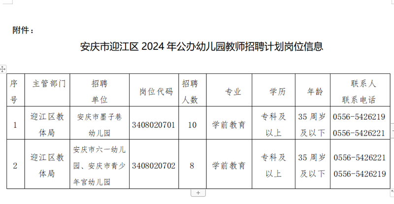 為進一步加強學(xué)前教育師資隊伍建設(shè),滿足迎江教育事業(yè)快速發(fā)展需要,迎江區(qū)教育體育局、迎江區(qū)人力資源和社會保障局共同組織面向社會公開招聘幼兒園教師。現(xiàn)就2024年迎江區(qū)公開招聘公辦幼兒教師有關(guān)工作事項公告如下:
