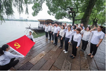 黨員們在浙江嘉興南湖紅船旁重溫入黨誓詞。圖片來源:新華社