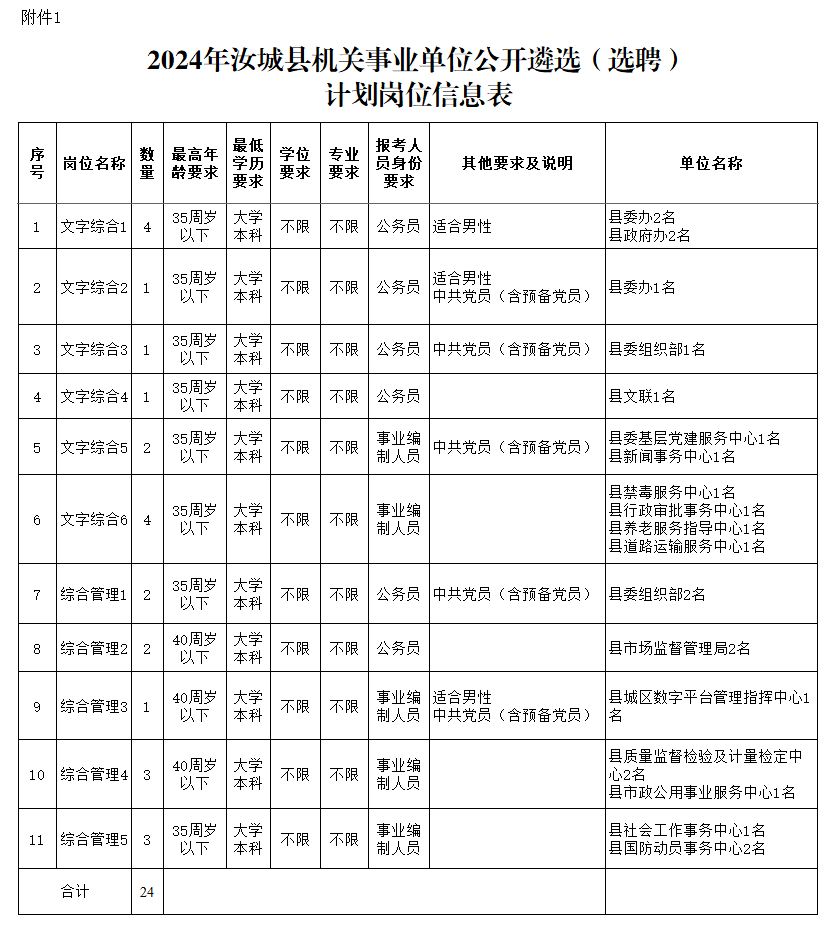 附件:1.2024年汝城縣機關事業(yè)單位公開遴選(選聘)計劃崗位信息表