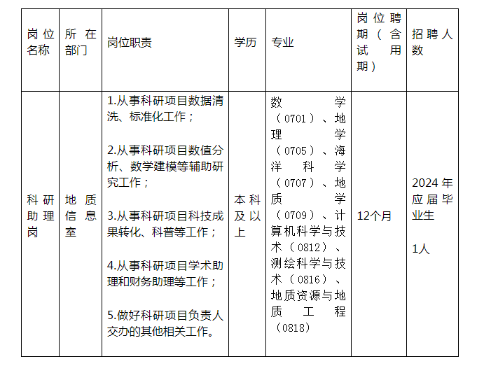根據(jù)工作需要,自然資源部中國地質(zhì)調(diào)查局青島海洋地質(zhì)研究所面向社會招聘科研助理1名,有關(guān)招聘事宜公告如下。