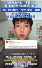 近日,博主“歡快土豆絲”發(fā)布了一條有關(guān)“如何對(duì)互聯(lián)網(wǎng)博主祛魅”的視頻,一位網(wǎng)友在評(píng)論區(qū)表達(dá)了自己不喜歡“空空日記”,“空空日記”回復(fù)了該評(píng)論,“我也不喜歡你”。之后,該網(wǎng)友發(fā)現(xiàn)自己被拉黑沒(méi)有辦法評(píng)論就在其他平臺(tái)發(fā)布了吐槽帖,