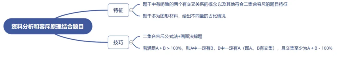 一般情況下,題干會涉及到兩個概念,通過題干判斷兩個概念是否有交叉關(guān)系,再看題目問法,如滿足容斥原理題目問法時,可以直接帶公式進行計算。