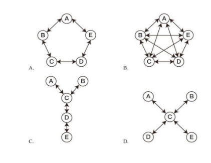 【答案】【解析】正確答案為D。第一步:找出定義要點(diǎn)。輪式網(wǎng)絡(luò):“一個下級同時與多個主管聯(lián)系”、“主管之間沒有溝通的情形”;Y式網(wǎng)絡(luò):“第二級有兩個上級與之聯(lián)系”、“第三級與一個或更多下級發(fā)生聯(lián)系”;環(huán)式網(wǎng)絡(luò):“每個成員僅與相鄰者聯(lián)系”、“不能與更遠(yuǎn)的成員進(jìn)行溝通”;全通道式網(wǎng)絡(luò):“所有成員間充分進(jìn)行溝通”、“所有成員的地位是平等的,無核心人物”。第二步:逐一分析選項(xiàng)。A項(xiàng):每個字符只與其相鄰的兩個字符間有聯(lián)系,與其他不相鄰的沒有聯(lián)系,符合“每個成員僅與相鄰者聯(lián)系”、“不能與更遠(yuǎn)的成員進(jìn)行溝通”,符合“環(huán)式網(wǎng)絡(luò)”定義,不符合“輪式網(wǎng)絡(luò)”定義,排除;B項(xiàng):每個字符與其他所有字符都有聯(lián)系,而且無核心字符,符合“所有成員間充分進(jìn)行溝通”、“所有成員的地位是平等的,無核心人物”,符合“全通道式網(wǎng)絡(luò)”定義,不符合“輪式網(wǎng)絡(luò)”定義,排除;C項(xiàng):字符C分別與兩個上級字符A、B以及一個下級字符D有聯(lián)系,符合“第二級有兩個上級與之聯(lián)系”、“第三級與一個或更多下級發(fā)生聯(lián)系”,符合“Y式網(wǎng)絡(luò)”定義,不符合“輪式網(wǎng)絡(luò)”定義,排除;D項(xiàng):字符C作為下屬時,分別與多個主管字符A、B、C、D有聯(lián)系,但是主管字符A、B、C、D之間沒有聯(lián)系,符合“一個下級同時與多個主管聯(lián)系”、“主管之間沒有溝通的情形”,符合“輪式網(wǎng)絡(luò)”定義,當(dāng)選。