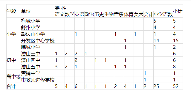 2024年城區(qū)學(xué)校擬選調(diào)教師合計52名。具體選調(diào)崗位和名額分配如下表: