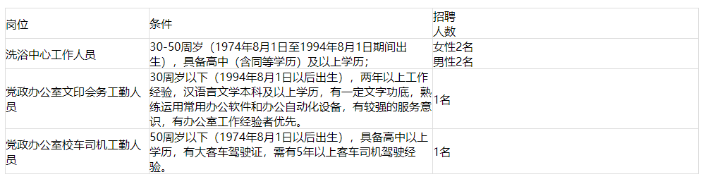 宿州職業(yè)技術(shù)學(xué)院委托安徽河川人力資源有限公司面向社會(huì)公開招聘洗浴中心工作人員4名、黨政辦公室文印會(huì)務(wù)工勤人員1名、黨政辦公室校車司機(jī)工勤人員1名。