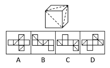 本題考查六面體。觀察題干立體圖形,三個斜線面為相鄰面,而A項中有兩個斜線面為相對面,即不可能是所給立方體展開圖。本題為選非題,故答案為A。