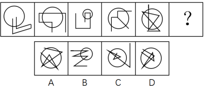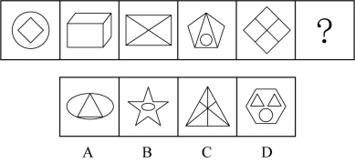 元素組成混亂,但題干與選項中每個圖形均出現(xiàn)了圓,優(yōu)先考慮圓內(nèi)外數(shù)量關(guān)系。圓內(nèi)點的數(shù)量分別為0,1,2,3,4,因此問號中圖形圓內(nèi)交點數(shù)量應(yīng)該為5,觀察四個選項,圓內(nèi)交點數(shù)分別為4,2,5,8,只有C項符合,故答案為C。