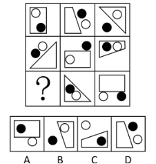 元素組成相似,九宮格每行都有黑白圓,還有一個長方形、一個梯形、一個三角形,因此第三行中還缺少一個梯形,排除A項。對比B、C、D三項,發(fā)現(xiàn)黑白圓所處位置不同,觀察題干黑白圓位置,發(fā)現(xiàn)每行黑白圓所處位置有三種:都在多邊形內(nèi)部,都在多邊形外部,白圓在多邊形內(nèi)部黑圓在外部,第三行還缺少一內(nèi)一外的情況,因此問號處圖形應(yīng)該為白圓在內(nèi)部,黑圓在外部,故答案為B。