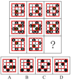 元素組成相同,先考慮位置規(guī)律。九宮格優(yōu)先橫著看,這種黑白點很多的圖形可以先看作內(nèi)外兩圈,第一行內(nèi)圈均為1個黑點,第二行內(nèi)圈均為2個黑點,第三行內(nèi)圈均為1個黑點,每行內(nèi)圈黑點的數(shù)量都相同,基本就能確定是內(nèi)外圈各有移動規(guī)律。