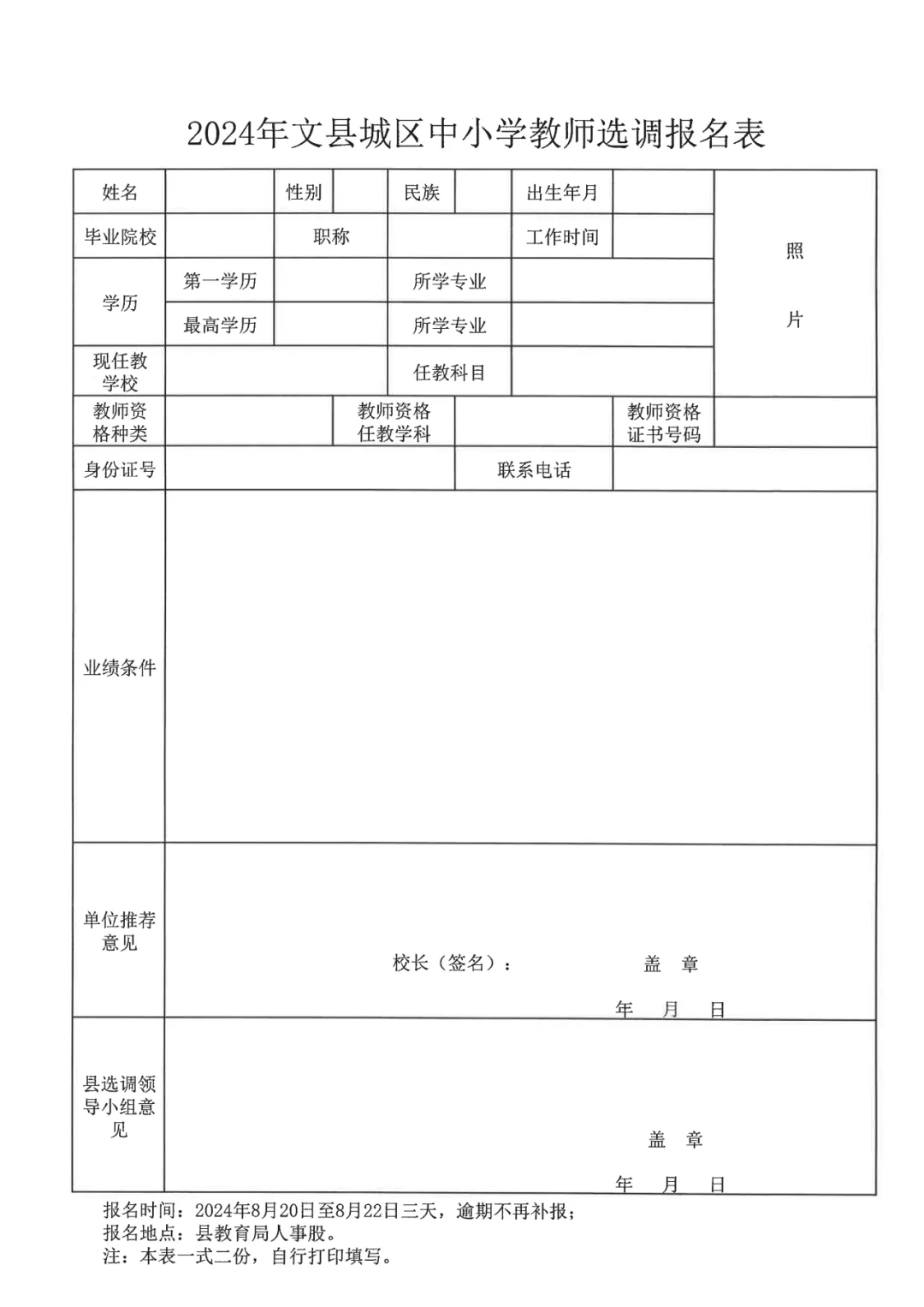 1.報(bào)名時(shí)間為2024年8月20日—8月21日,每日上午8:30—20:00,逾期不再補(bǔ)報(bào),報(bào)名地點(diǎn)縣教育局人事股。
