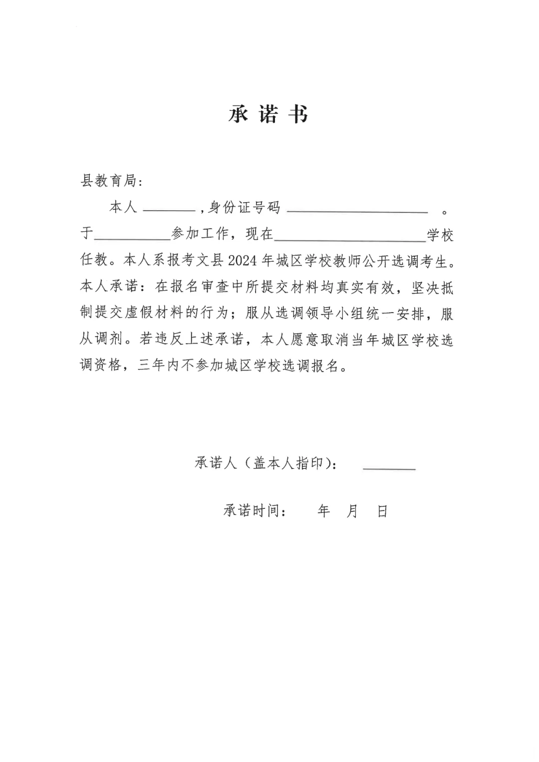 參加城區(qū)選調(diào)人員必須服從選調(diào)領(lǐng)導(dǎo)小組統(tǒng)一安排和調(diào)劑;個(gè)人簽訂承諾書,承諾書要按個(gè)人誠(chéng)信檔案相關(guān)要求,所提供報(bào)考材料必須真實(shí)準(zhǔn)確;對(duì)提交虛假報(bào)名材料的,一經(jīng)發(fā)現(xiàn)取消當(dāng)年報(bào)考資格,三年內(nèi)不得參加城區(qū)教師選調(diào)報(bào)名;報(bào)考人員所在學(xué)校開(kāi)具虛假證明的,對(duì)出具證明的學(xué)校負(fù)責(zé)人和相關(guān)人員將給予相應(yīng)組織處理。