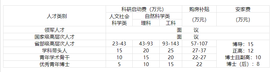?。?)學(xué)校為全職在我校工作的引進人才提供博士學(xué)位津貼、安家費、購房補貼和科研啟動費等,安家費、購房補貼(分5年支付)和科研啟動費標(biāo)準(zhǔn)見《全職引進人才享受優(yōu)惠待遇參照表》,博士學(xué)位津貼按每月1000元發(fā)放。