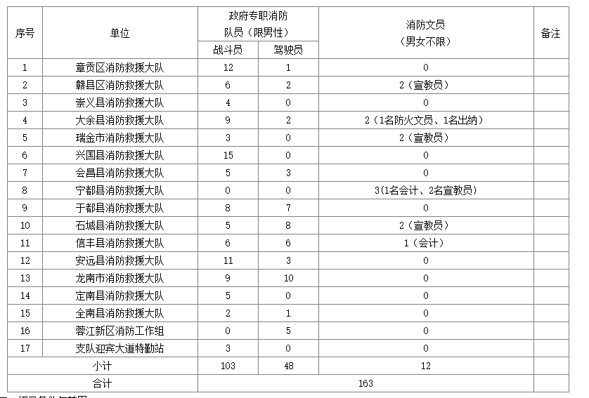 ?。ㄒ唬┐舜握畬B毾狸爢T和消防文員招聘工作由贛州市消防救援支隊組織。