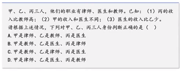 【答案】C【解析】第一步,確定題型。題干有明顯的信息匹配特征,確定為分析推理。第二步,分析條件,進(jìn)行推理。根據(jù)①可知,丙不是教師,排除D項(xiàng),根據(jù)③可知乙不是醫(yī)生,排除B項(xiàng),此時(shí)不能確定最后答案,故可尋找最大信息,三個(gè)條件中的最大信息是醫(yī)生,所以從醫(yī)生入手,由②③知甲、乙都不是醫(yī)生,那么醫(yī)生是丙,根據(jù)題意可列不等式:教師收入<醫(yī)生的收入<乙,所以教師是甲。因此,選擇C選項(xiàng)。