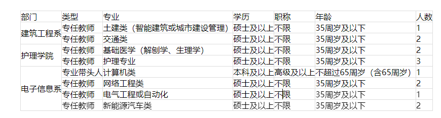 1、專業(yè)、學(xué)歷、職稱條件詳見表格,有職稱、教學(xué)經(jīng)驗(yàn)或有企業(yè)工作經(jīng)歷并取得職業(yè)資格證書者優(yōu)先。