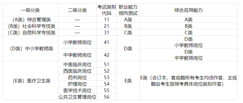 不同類型的招聘崗位使用不同的筆試試題,試題按崗位類別分為綜合管理類(A類)、社會(huì)科學(xué)專技類(B類)、自然科學(xué)專技類(C類)、中小學(xué)教師類(D類)和醫(yī)療衛(wèi)生類(E類)五個(gè)考試類別。