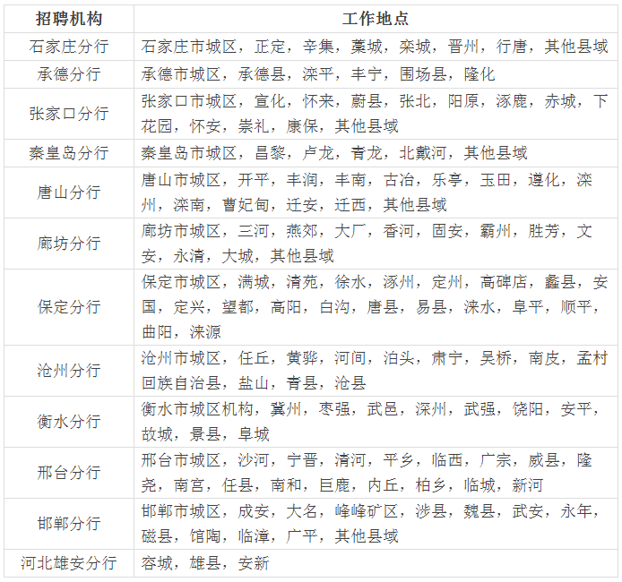 3.大學(xué)生村官及“三支一扶”人員專項(xiàng)報(bào)名通道主要面向以下機(jī)構(gòu)開放:所轄各地市(河北雄安分行、承德分行除外)的縣域機(jī)構(gòu)。