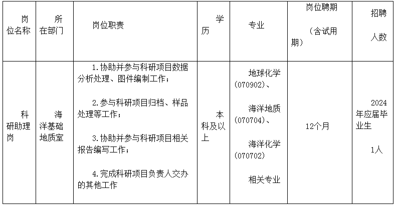 根據(jù)工作需要,自然資源部中國地質(zhì)調(diào)查局青島海洋地質(zhì)研究所招聘科研助理1名,有關(guān)招聘事宜公告如下。