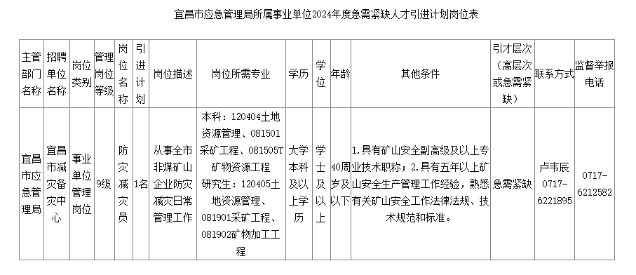 本次引進急需緊缺人才1名,涉及1個單位1個崗位。引進條件詳見《宜昌市應急管理局所屬事業(yè)單位2024年度急需緊缺人才引進計劃崗位表》(以下簡稱《崗位表》)。
