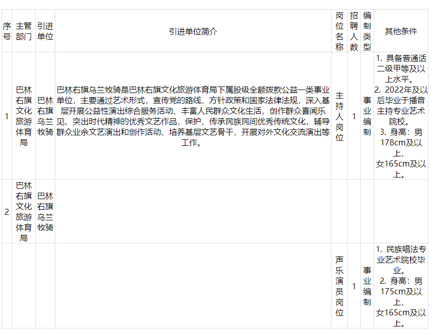 本次巴林右旗烏蘭牧騎引進人才2名。其中聲樂演員(民族唱法)1名、主持人1名。詳見《赤峰市巴林右旗烏蘭牧騎2024年“綠色通道”引進事業(yè)編制人才崗位計劃表》(附件)。