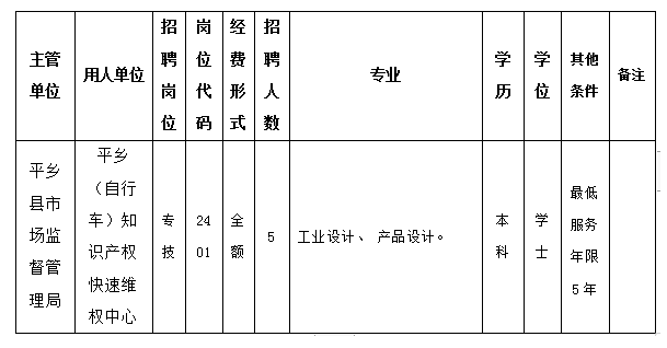為滿足縣市場監(jiān)管局所屬平鄉(xiāng)(自行車)知識產(chǎn)權(quán)快速維權(quán)中心用人需要,根據(jù)《河北省事業(yè)單位公開招聘工作人員暫行辦法》,結(jié)合2024年用人單位工作人員招聘計劃和崗位空缺情況,平鄉(xiāng)縣人力資源和社會保障局?jǐn)M面向社會公開招聘全額財政事業(yè)編制人員5名。現(xiàn)公告如下: