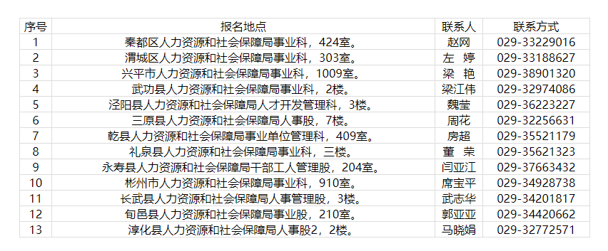 2.報(bào)名地點(diǎn):各縣市區(qū)人社局。參加本次公開選聘的應(yīng)聘人員報(bào)名由各縣市區(qū)人社局進(jìn)行資格審查,審核匯總后報(bào)市人社局,市人社局對初審情況進(jìn)行查驗(yàn),查驗(yàn)合格后在咸陽市人力資源和社會(huì)保障局網(wǎng)站發(fā)布通過人員名單。
