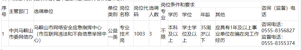 為認(rèn)真做好中共馬鞍山市委網(wǎng)信辦所屬事業(yè)單位馬鞍山市網(wǎng)絡(luò)安全應(yīng)急指揮中心(市互聯(lián)網(wǎng)違法和不良信息舉報(bào)中心)公開(kāi)選調(diào)人員工作,根據(jù)工作需要,結(jié)合實(shí)際,公告如下。