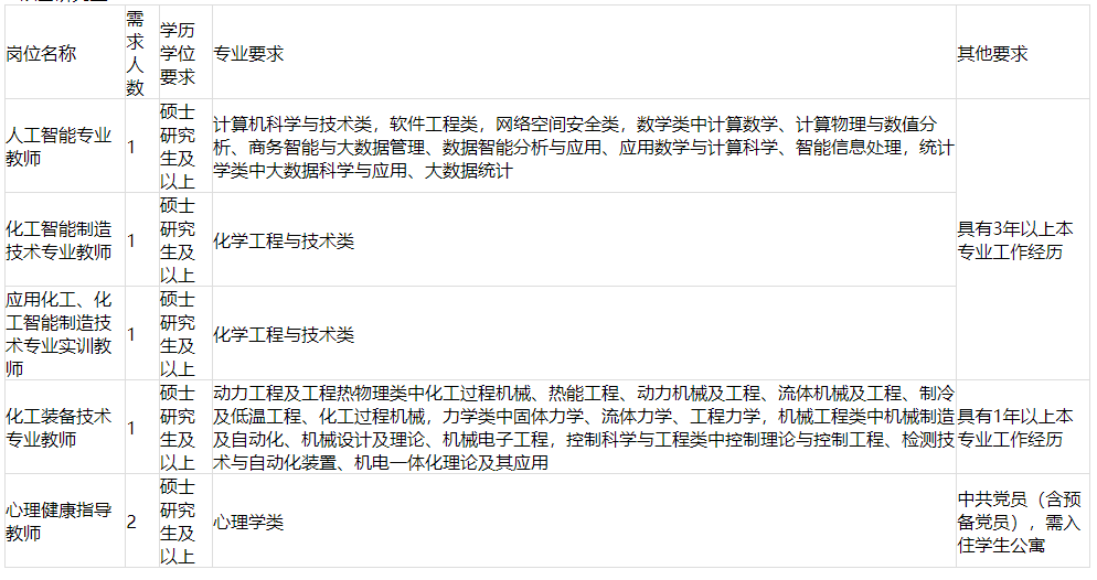 化工智能制造技術(shù)專業(yè)教師 | 1 | 博士研究生 | 化學(xué)工程與技術(shù)類,信息與通信工程類,計(jì)算機(jī)科學(xué)與技術(shù)類 |