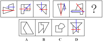 【答案】D【解析】第一步,觀察特征。組成元素不同,優(yōu)先考慮數(shù)量類或?qū)傩灶?,每幅圖形均由兩個(gè)對(duì)稱圖形組成,考慮對(duì)稱性。第二步,兩段式,第一段找規(guī)律,第二段應(yīng)用規(guī)律。第一段,每幅圖中兩個(gè)圖形對(duì)稱軸的夾角分別為0°、45°、90°;第二段應(yīng)用此規(guī)律,前兩幅圖形中兩個(gè)圖形對(duì)稱軸夾角分別為0°、45°,所以問號(hào)處應(yīng)為90°,如下圖所示,只有D項(xiàng)符合。