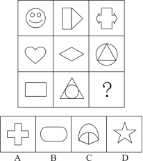 【答案】D【解析】第一步,觀察特征。組成元素不同,優(yōu)先考慮數(shù)量類或?qū)傩灶悾瑢?duì)稱特征明顯,考慮屬性類對(duì)稱性。第二步,九宮格,橫向規(guī)律較為常見,優(yōu)先考慮。第一行中三個(gè)圖形的對(duì)稱軸條數(shù)分別是1、1、2;第二行中三個(gè)圖形的對(duì)稱軸條數(shù)分別是1、2、3;前兩個(gè)圖形的對(duì)稱軸條數(shù)之和等于第三個(gè)圖形的對(duì)稱軸條數(shù)。第三行應(yīng)用規(guī)律,前兩個(gè)圖形的對(duì)稱軸條數(shù)分別為2、3,2+3=5,所以問號(hào)處的圖形應(yīng)有5條對(duì)稱軸,只有D項(xiàng)符合。因此,選擇D選項(xiàng)。