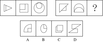 【答案】C【解析】第一步,觀察特征。組成元素不同,優(yōu)先考慮屬性類或數(shù)量類。對(duì)稱特征明顯,考慮屬性類對(duì)稱性。第二步,兩段式,第一段找規(guī)律,第二段應(yīng)用規(guī)律。第一段三個(gè)圖形均為軸對(duì)稱圖形,對(duì)稱軸方向分別為:橫軸、斜軸(\)、豎軸,即對(duì)稱軸依次順時(shí)針旋轉(zhuǎn)45°;第二段應(yīng)用規(guī)律,前兩圖的對(duì)稱軸方向?yàn)樾陛S(\)、豎軸,問號(hào)處應(yīng)為斜軸(/),只有C項(xiàng)符合。因此,選擇C選項(xiàng)。