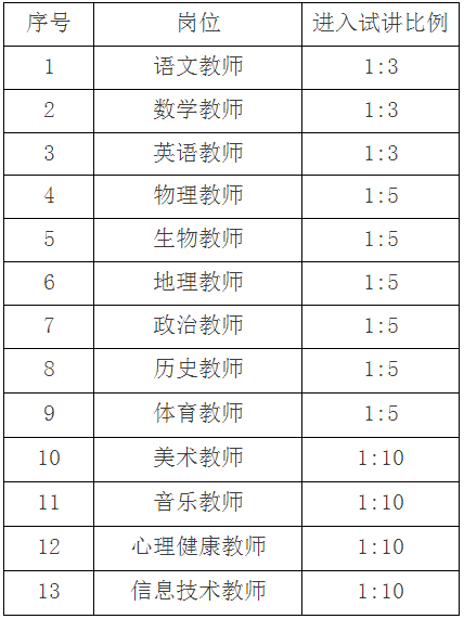 若實(shí)際參加考核人數(shù)與招聘人數(shù)超過(guò)“進(jìn)入試講比例”的崗位(具體比例見(jiàn)下表),先進(jìn)行面試,根據(jù)面試成績(jī)按該比例確定進(jìn)入試講人員,面試成績(jī)不計(jì)入綜合成績(jī);未超過(guò)該比例的崗位,全部資格審查合格人員進(jìn)行試講。試講成績(jī)=綜合成績(jī)。
