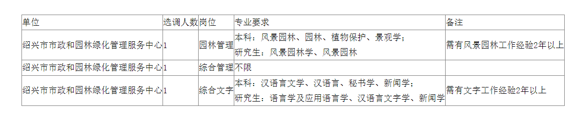 紹興市市政和園林綠化管理服務(wù)中心公開選調(diào)事業(yè)編制人員3名,其中1名從事園林管理工作,1名從事綜合管理工作,1名從事綜合文字相關(guān)工作。