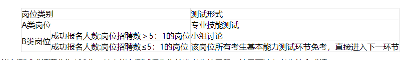 (4)基本能力測(cè)試主要采取專(zhuān)業(yè)技能測(cè)試、小組討論等形式,對(duì)考生進(jìn)行考察。各崗位具體考核形式見(jiàn)下表。
