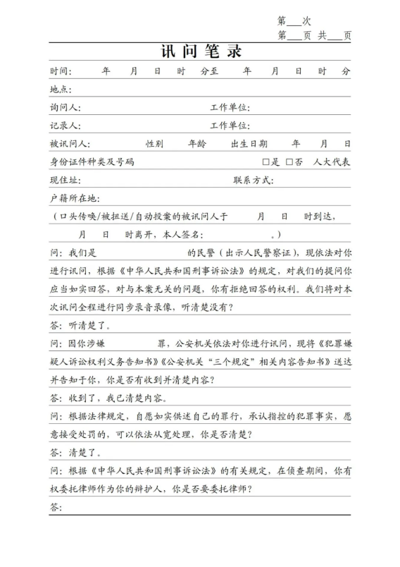 【同錄告知】鑒于部分地區(qū)要求刑事訊問一律同錄,故在首問明確告知“本次訊問全程進(jìn)行同步錄音錄像”,如無此類要求,則僅在需要進(jìn)行同錄的案件中注明告知該事項(xiàng)即可。