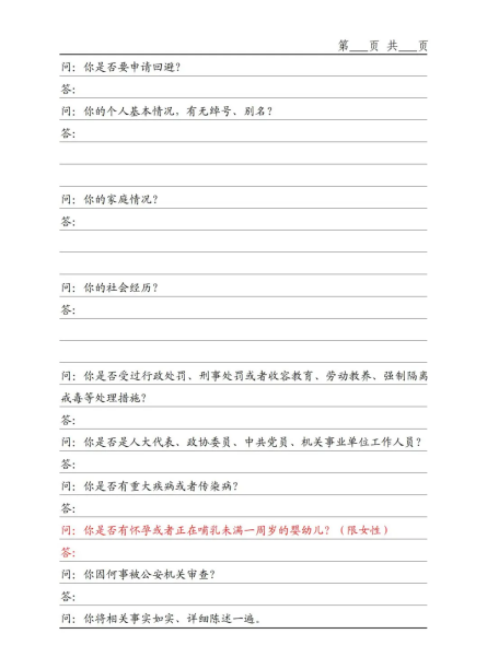 【個(gè)人情況】實(shí)務(wù)中,對(duì)于筆錄頭已載明“被訊問人姓名、性別等”相關(guān)事項(xiàng)時(shí)應(yīng)否在訊問中再次問明個(gè)人情況頗有爭議。有不少辦案人員遺漏此問,但有觀點(diǎn)認(rèn)為“載明≠問明”,因此建議在訊問過程中仍需再次核對(duì)被訊問人相關(guān)基本信息,包括有無別名、化名、綽號(hào)等。