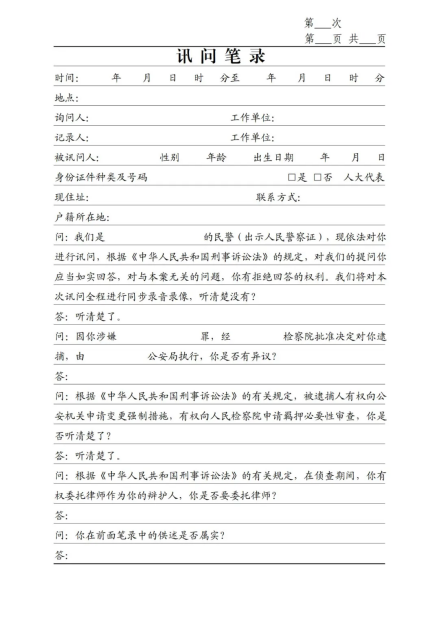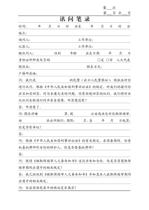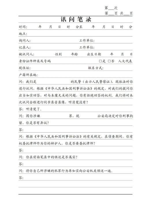《訊問筆錄》(第一次、刑拘、逮捕、取保、監(jiān)居)模板