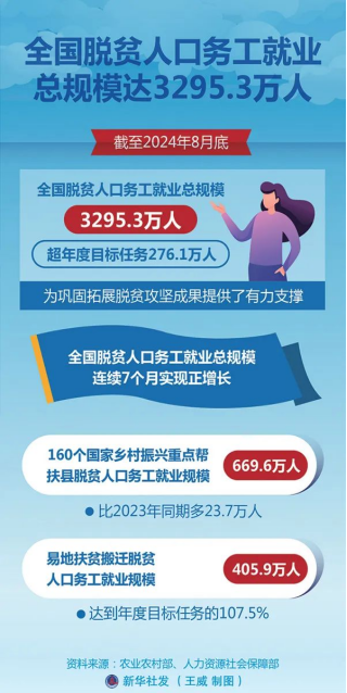 今年以來各級各相關(guān)部門深入開展防止返貧就業(yè)攻堅行動,截至8月底,全國脫貧人口務(wù)工就業(yè)總規(guī)模達(dá)到3295.3萬人,超年度目標(biāo)任務(wù)276.1萬人,為鞏固拓展脫貧攻堅成果提供了有力支撐。新華社發(fā) 王威/制圖