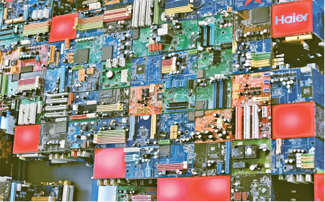 我國(guó)實(shí)施全面節(jié)約戰(zhàn)略,大力發(fā)展循環(huán)經(jīng)濟(jì)。圖為2024年9月27日,在海爾綠色再循環(huán)互聯(lián)工廠展廳內(nèi)拍攝的用廢舊電路板制作的裝飾墻。海爾綠色再循環(huán)互聯(lián)工廠每年可拆解廢舊家電200萬(wàn)臺(tái),再生循環(huán)新材料約3萬(wàn)噸。新華社記者李紫恒/攝