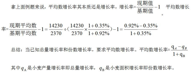 題目問題出現(xiàn)兩個時間對比+平均數(shù)+增加/減少+百分之幾。如:2023年全國小麥產(chǎn)量14230萬噸,較上年增長0.92%;小麥種植面積2370萬公頃,較上年增長0.35%。問:2023年全國的小麥單位面積產(chǎn)量與上一年相比增長/減少了百分之幾?即問題中出現(xiàn)了兩個時間對比+平均數(shù)+增加/減少+百分之幾。這道題求的就是平均數(shù)的增長率。