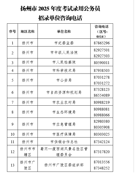 1.揚州市2025年度考試錄用公務(wù)員招錄機關(guān)(單位)咨詢電話