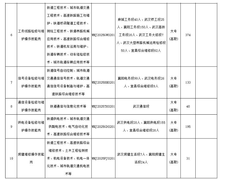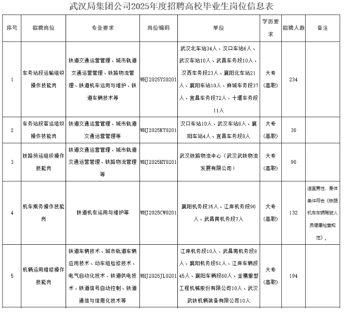 武漢局集團公司2025年度招聘高校畢業(yè)生崗位信息表