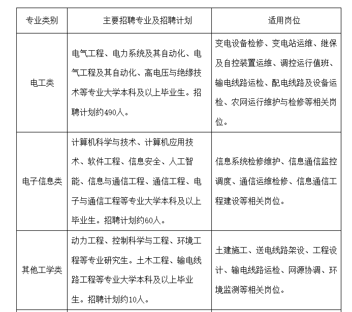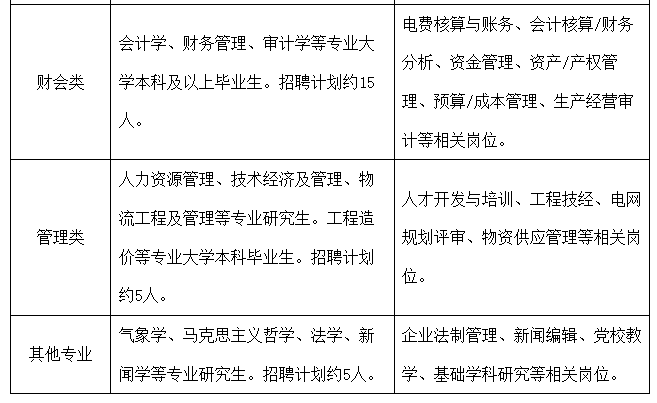 招聘專業(yè)類別為電工類、電子信息類、其他工學(xué)類、財會類、管理類及其他專業(yè),招聘專業(yè)是指主修專業(yè),不包含輔修專業(yè)。最終招聘數(shù)量將根據(jù)上級單位核定情況相應(yīng)調(diào)整,第一批招聘數(shù)量(含提前批校園招聘數(shù)量)暫定如下: