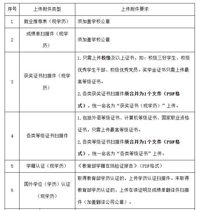 3.上傳應(yīng)聘附件材料。應(yīng)聘畢業(yè)生須通過招聘平臺及時、規(guī)范上傳個人應(yīng)聘附件材料,應(yīng)聘附件材料文檔數(shù)量不超過7個。應(yīng)聘畢業(yè)生應(yīng)確保應(yīng)聘材料能正常打開、清晰顯示,因應(yīng)聘材料不能正常打開、圖像不清晰或未按規(guī)范要求填報導(dǎo)致的結(jié)果由應(yīng)聘畢業(yè)生本人承擔(dān)。上傳附件具體要求如下: