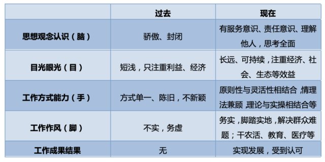 1.思想觀念認(rèn)識(shí)上,從自視甚高到理解農(nóng)民,融通群眾;從固執(zhí)己見到聽取領(lǐng)導(dǎo)意見,服務(wù)人民。