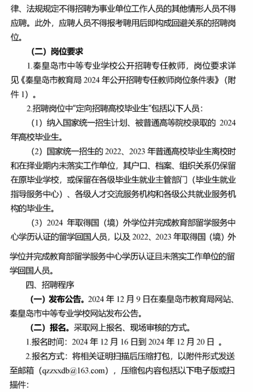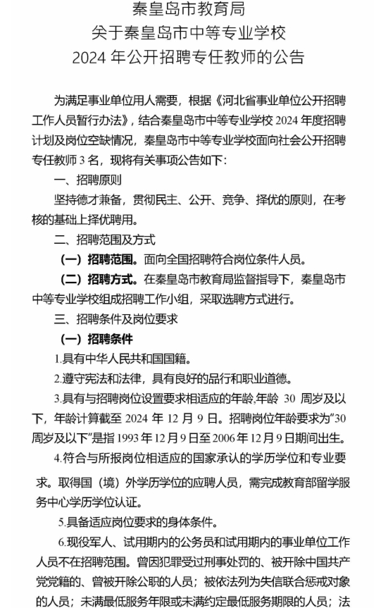 秦皇島市教育局關(guān)于市中等專業(yè)學(xué)校2024年公開招聘專任教師的公告