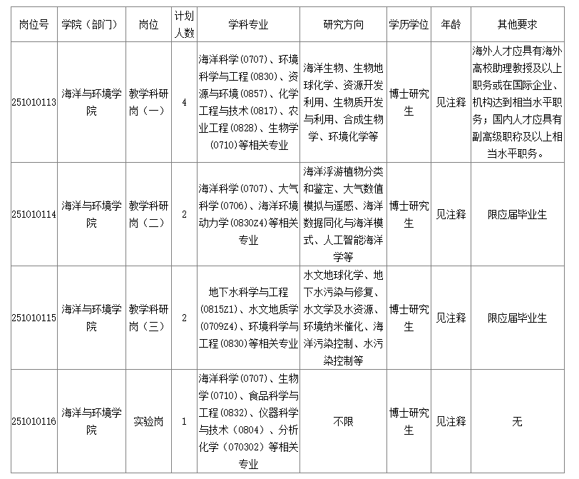 天津科技大學(xué)海洋與環(huán)境學(xué)院2025年第一批公開招聘計(jì)劃表(博士或副高及以上崗位)