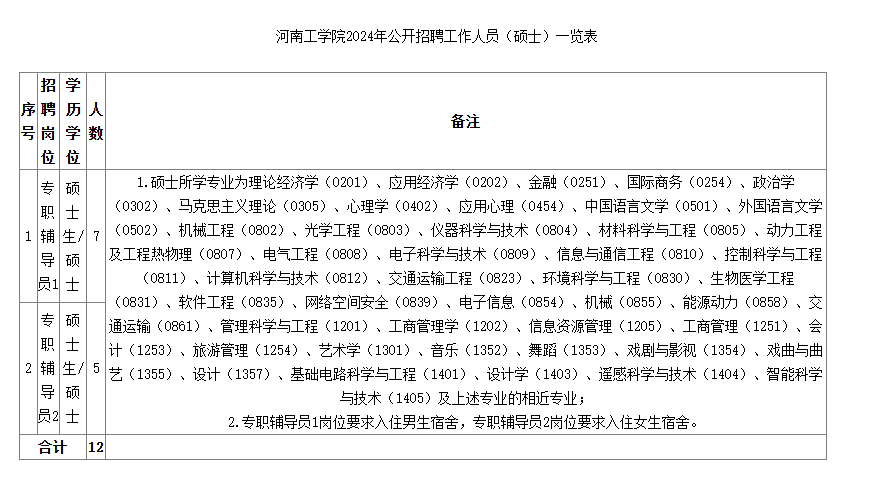 根據(jù)我校專業(yè)技術(shù)人員崗位空缺情況和學(xué)校發(fā)展需要,擬招聘碩士畢業(yè)生12名。招聘專業(yè)及計劃見附件《河南工學(xué)院2024年公開招聘工作人員(碩士)一覽表》(以國務(wù)院學(xué)位委員會、教育部印發(fā)的《研究生教育學(xué)科專業(yè)目錄(2022年)》為準(zhǔn),學(xué)科括號內(nèi)的專業(yè)方向僅為招聘崗位條件要求,不作為資格審核依據(jù))。