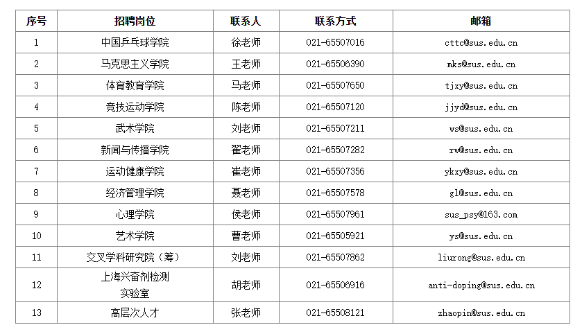 應(yīng)聘方式:應(yīng)聘者填寫《2025年上海體育大學(xué)應(yīng)聘人員信息表》(詳見附件2),連同相關(guān)材料(個(gè)人簡歷、身份證、學(xué)歷、學(xué)位、專業(yè)技術(shù)職稱、獲獎(jiǎng)證書、個(gè)人成果的復(fù)印件等集成一個(gè)PDF),通過電子郵件(郵件主題為:應(yīng)聘崗位+姓名)發(fā)送至各用人部門郵箱。